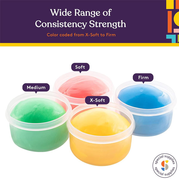 Colores divertidos y aptos para niños: Cada set de plastilina terapéutica para adultos y niños incluye 4 envases individuales, cada uno con un color brillante. Esto facilita la terapia con códigos de colores o la rotación de su uso diario.